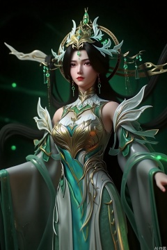 1girl, solo, long hair, black hair, hair ornament, dress, The image depicts a highly detailed and stylized digital artwork of a female character. She is adorned in intricate armor that features a mix of metallic and organic elements, with a prominent green and white color scheme. Her attire includes a headpiece that resembles a crown, and her long, flowing hair is elaborately styled. The character is holding a sword in her right hand, which is partially visible. The background is dark, with a subtle glow emanating from the character's surroundings, giving an ethereal and mystical atmosphere. The overall composition suggests a fantasy or mythological theme.
