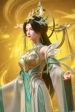 1girl, solo, long hair, black hair, hair ornament, dress, The image depicts a digitally rendered figure of a woman dressed in an elaborate, traditional outfit. The attire is predominantly white with intricate gold patterns and green accents, giving it a regal appearance. The woman's hair is long and flowing, adorned with ornate golden headpieces that match the elegance of her attire. Her expression is serene and confident, with her right hand extended outward, seemingly channeling or directing energy. The background is a warm, golden hue, with swirling, ethereal light effects that enhance the mystical and magical atmosphere of the scene.