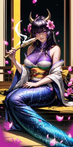 HEZI,Hot girls,Two dimensional,hand drawing,atmosphere,1girl, hair ornament, holding, monster girl, kimono, japanese clothes, lamia, hair flower, breasts, long hair, black hair, bangs, flower, solo, hand fan, looking at viewer, glowing, long sleeves, large breasts, glowing eyes, hand up, smoke, wide sleeves, purple eyes, indoors, pink eyes, mermaid, detached sleeves, fingernails, holding fan, sitting, ghost, sharp fingernails, parted lips, scales, colored skin, horns, artist name, night, official alternate costume, snake, solo focus, jewelry, closed mouth, purple lips, medium breasts, petals, smoking pipe, bare shoulders, claws, animal, alternate costume, obi, smile, outdoors, hair stick, teeth, magic, long fingernails, sash, purple hair, comb, shiny, mole, folding fan,<lora:辣妹-000022:0.7>,
