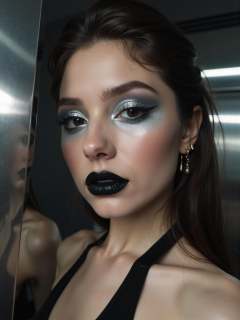 This close-up focuses on her upper body,capturing her poised and alluring stance,with her face slightly blurred due to the DOF,further emphasizing her sensual pose and the surrounding muted,intimate setting.Her eyes are dramatic with silver chrome eyeshadow,applied thickly with a reflective,mirror-**** finish that makes her eyes the focal point of the look.Her lips are painted a deep,glossy black with subtle silver undertones,adding a mysterious,edgy contrast.Her cheekbones are accentuated with silver highlighter,blending seamlessly with her eyeshadow.The background is a polished chrome wall,creating reflections and a futuristic,cutting-edge atmosphere,enhancing the metallic shimmer of her makeup.,