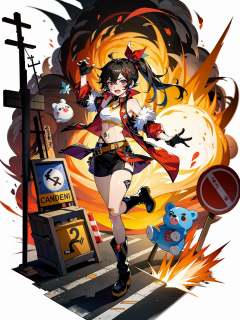 hezi,Japanese and Korean art,game characters,special effects,1girl,black hair,red eyes,thighhighs,single thighhigh,anger vein,open mouth,boots,gloves,sign,black footwear,black shorts,navel,road sign,detached sleeves,skirt,midriff,hair ornament,shorts,holding,long hair,white background,black gloves,bandaid,black thighhighs,fingerless gloves,solo,black skirt,looking at viewer,asymmetrical legwear,bare shoulders,belt,full body,side ponytail,red ribbon,explosion,blush,teeth,red jacket,uneven legwear,vest,ribbon,fang,angry,sleeveless,standing on one leg,jacket,weapon,crop top,teddy bear,warning sign,hair ribbon,hair between eyes,open clothes,<lora:日韩立﷿-000013:0.7>,