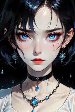 hezi, brilliant color, brush texture, beauty, 1girl, jewelry, solo, earrings, blue eyes, looking at viewer, short hair, dripping, black hair, portrait, necklace, choker, blue hair, makeup, closed mouth, gem, eyelashes, rain, blue gemstone, lips, black shirt, blurry, red lips, eyeshadow, blurry background, black choker, wet, straight-on, collarbone, upper body, expressionless,<lora:纯彩﷿丽质感-000016:0.65>,