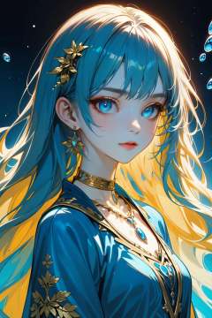 hezi,brilliant color,brush texture,beauty,A fantasy-themed digital illustration featuring a female character,she has long blue hair and bright blue eyes,adorned with small golden horn-**** accessories on her head,wearing a detailed blue and white dress with gold embroidery,a choker necklace with a blue pendant,and earrings,the character has a serene expression,the background depicts a dynamic blue ocean with waves and bubbles,the overall color palette is dominated by shades of blue and white,the artwork combines elements of fantasy and elegance,capturing a mystical and enchanting atmosphere.,<lora:纯彩﷿丽质感-000016:0.65>,