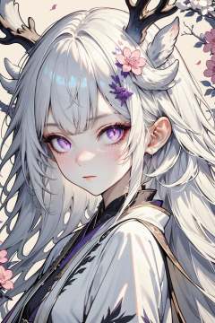 hezi, brilliant color, brush texture, beauty, 1girl, flower, solo, antlers, horns, looking at viewer, long hair, hair ornament, purple eyes, white hair, hair flower, purple flower, upper body, closed mouth, animal ears, pink flower, expressionless, dragon horns, branch, portrait, dragon girl, japanese clothes, from side, blush, slit pupils<lora:纯彩﷿丽质感-000016:0.65>,