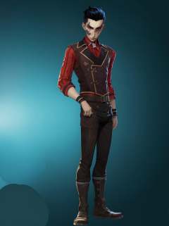 HEZI,Character design,European and American stylized characters,game characters,1boy,male focus,solo,black hair,boots,black pants,scar,pants,standing,full body,short hair,shirt,ascot,vest,simple background,scar on face,looking at viewer,belt,jacket,long sleeves,brown footwear,heterochromia,scar across eye,blue background,gradient,wristband,multicolored hair,blood,clenched hand,gradient background,red vest,closed mouth,<lora:双城希尔科人设-000010:0.75>,
