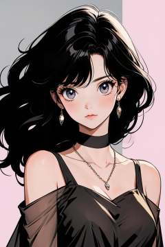 hezi, Showa Manga style, avatar, secondary Yuan, retro, sense of time, jewelry, 1girl, earrings, necklace, black hair, long hair, choker, looking at viewer, bare shoulders, black choker, solo, blurry background, upper body, blurry, night, closed mouth, bangs, solo focus, shoulder cutout, breasts, clothing cutout, grey eyes, collarbone, floating hair, wavy hair,<lora:昭和日漫风格-000021:0.6>,