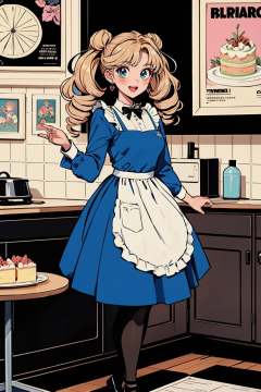 hezi,Showa Manga style,avatar,secondary Yuan,retro,sense of time,jewelry,earrings,necklace, lol style, Splash art, Cool, game art, Game art, LOL propaganda poster texture, smile, bangs, bow, long hair, dress, indoors, 1girl, oversized object, blonde hair, twin drills, teeth, :d, holding, pink hair, drill hair, striped, long sleeves, black bow, hair bow, two-tone hair, upper teeth only, food, twintails, multicolored hair, maid, pantyhose, blue dress, shoes, pink flower, open mouth, tongue, bowtie, maid headdress, heterochromia, black footwear, frilled dress, shiny, flower, frills, green hair, cone hair bun, window, cake, parted bangs, striped pantyhose, heart, official alternate costume, table, feet out of frame, apron, standing, shiny hair, leg up, hair bun, black bowtie, green eyes, foot out of frame, white apron, solo, looking at viewer, creature, blue eyes,<lora:昭和日漫风格-000021:0.6>,
