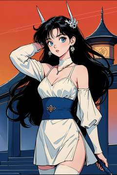 hezi,Showa Manga style,avatar,secondary Yuan,retro,sense of time,jewelry,earrings,necklace,lol style, Splash art, Cool, game art, Game art, LOL propaganda poster texture, 1girl, floating weapon, floating object, long hair, solo, weapon, floating, black hair, white dress, blue eyes, breasts, dress, hair ornament, sword, detached sleeves, jewelry, thighhighs, parted lips, flower, medium breasts, armor, cleavage, bare shoulders, cowboy shot, earrings, very long hair, polearm, outdoors, knife, arm up, teeth, standing, headgear, bangs, lips, spear, long sleeves, architecture, dagger, from below, looking to the side, looking away, magic, hand up, blurry, cleavage cutout, looking at viewer, glowing, floating hair, shoulder armor, white thighhighs, chinese clothes, blurry background, armored dress, east asian architecture, flying, thigh boots, dutch angle, sky, dragon, clothing cutout, fantasy, smoke, red sky<lora:昭和日漫风格-000021:0.6>,
