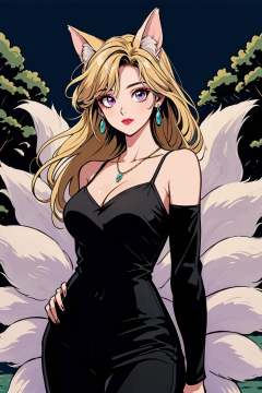 hezi,Showa Manga style,avatar,secondary Yuan,retro,sense of time,jewelry,earrings,necklace,lol style,Splash art,Cool,game art,Game art,LOL propaganda poster texture,1girl,long hair,animal ears,breasts,magic,bangs,bare shoulders,dress,outdoors,blonde hair,fox ears,ahri \(league of legends\),tail,fox tail,hair over one eye,solo focus,bird,medium breasts,armor,cleavage,tree,smile,glowing,black dress,multiple others,gem,detached sleeves,night,looking at viewer,red lips,long sleeves,orb,nature,forest,weapon,alternate costume,closed mouth,helmet,pants,cowboy shot,pink eyes,solo,multiple tails,blue eyes,official alternate costume,green eyes,standing,facial mark,green hair,dark,fox girl,large breasts,crow,sword,lipstick,makeup,animal,helm,1other,purple lips,2others,one eye covered,energy ball,black pants,glowing eyes,lips,whisker markings,breastplate,<lora:昭和日漫风格-000021:0.6>,