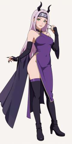 hezi,Naruto character design,(headband:1.3),Character Design, animation art, quadratic, bright colors, , 1girl, solo, long hair, thighhighs, green eyes, dress, full body, looking at viewer, veil, grey background, smile, breasts, pelvic curtain, simple background, bridal gauntlets, multicolored hair, standing, large breasts, black thighhighs, gloves, very long hair, black hair, high heels, hair ornament, purple dress, elbow gloves, mouth veil, purple hair, see-through, boots, fingernails, bare shoulders, black gloves, purple footwear, closed mouth, chinese clothes, watson cross, hair stick, streaked hair, personification, horns, pink hair,<lora:火影人物设计2.0-000014:0.6>,
