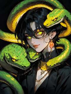 Year of the Snake illustration, Snake Man, atmosphere, 1boy, jewelry, male focus, green eyes, earrings, glowing, solo, glowing eyes, looking at viewer, short hair, black background, chain, simple background, snake, black hair, gem, parted lips, upper body, long sleeves, animal, bangs, hair between eyes, eyelashes, hand up, holding, smile, shirt, necklace, scales, black jacket,<lora:蛇人3.0-000016:0.8>,