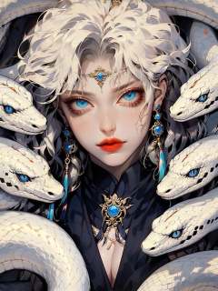 Year of the Snake illustration, Snake Man, atmosphere, 1girl, blue eyes, snake, jewelry, earrings, looking at viewer, white snake, white hair, long hair, solo, closed mouth, animal, realistic, slit pupils, gem, portrait, lips, circlet, red lips<lora:蛇人3.0-000016:0.8>,