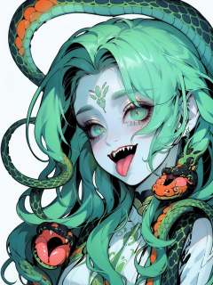 Year of the Snake illustration, Snake Man, atmosphere, 1girl, snake hair, tongue, forked tongue, open mouth, tongue out, long hair, solo, scales, snake, fangs, white background, looking at viewer, simple background, monster girl, red eyes, slit pupils, teeth, colored skin, wavy hair, upper body, green hair, blush, eyelashes, breasts, smile, sarashi, forehead jewel, grey skin, colored sclera<lora:蛇人3.0-000016:0.8>,