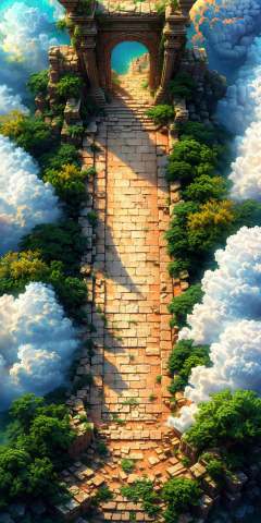 HEZI, 3d vertical scene, game scene, vertical game, no humans, cloud, scenery, sky, outdoors, day, tree, blue sky, arch, stairs, cloudy sky, ruins, fantasy, stone wall, plant, nature, moss, sunlight, pillar,<lora:3d竖版场景-000014:0.8>,