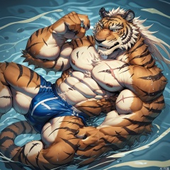solo, long hair, looking at viewer, 1boy, animal ears, nipples, tail, full body, white hair, male focus, thighs, lying, on back, stomach, wet, muscular, scar, thick thighs, abs, pectorals, muscular male, bara, scar on face, furry, large pectorals, bulge, topless male, scar across eye, furry male, tiger ears, white fur, tiger tail, male swimwear, scar on chest, swim briefs, fluffy, tiger boy, scar on leg,character:PangSP