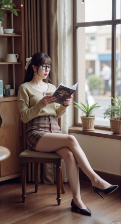 1girl, solo, sitting on a vintage wooden stool in a cozy café corner, legs crossed, wearing a knitted beige sweater and high-waisted plaid skirt, sipping a latte with foam art, holding an open paperback book titled "The Night Circus", steam rising from the cup, surrounded by potted plants and hanging string lights, wooden shelves with mismatched mugs, sunlight streaming through lace curtains, other patrons chatting softly in the background, masterpiece, best quality, high quality, overexposure, chromatic_aberration, light, fair_skin, very aesthetic, absurdres, masterpiece, amazing quality, (aestivation:0.4), (nasii:0.4), (toosaka asagi:0.4), (atdan:0.4), (artist:quasarcake:0.8), (iumu:0.72), (wlop:0.72), 96YOTTEA, Konya Karasue, //, depth of field, detailed light, blurry background, best shadow, shiny skin, cinematic lighting, ray tracing, amazing quality, very aesthetic, absurdres, best quality, ultra detailed, newest, 8K, HDR