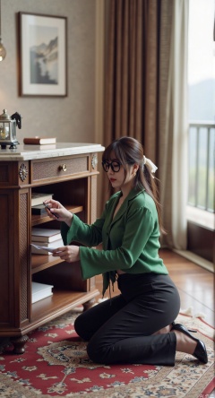 1girl, solo, kneeling on a Persian rug in a minimalist study, organizing leather-bound journals into a brass-trimmed bookshelf, wearing a silk emerald-green blouse and tailored black trousers, strands of chestnut hair falling forward, holding a fountain pen mid-air, a marble desk with a vintage inkwell and wax seal set, floor-to-ceiling windows framing a misty mountain view, abstract wall art in muted tones, a geometric floor lamp casting warm shadows, subtle dust motes in the sunlight, masterpiece, best quality, high quality, overexposure, chromatic_aberration, light, fair_skin, very aesthetic, absurdres, masterpiece, amazing quality, (aestivation:0.4), (nasii:0.4), (toosaka asagi:0.4), (atdan:0.4), (artist:quasarcake:0.8), (iumu:0.72), (wlop:0.72), 96YOTTEA, Konya Karasue, //, depth of field, detailed light, blurry background, best shadow, shiny skin, cinematic lighting, ray tracing, amazing quality, very aesthetic, absurdres, best quality, ultra detailed, newest, 8K, HDR