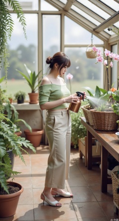 1girl, solo, standing in a greenhouse filled with exotic orchids, wearing a cropped linen blouse and wide-leg trousers, misting plants with a copper spray bottle, her brunette hair gathered in a messy bun, a wicker basket of seedlings at her feet, sunlight refracting through glass panes onto hanging ferns, terracotta pots stacked in the corner, a stone pathway winding toward a koi pond, distant thunderclouds 暗示rain approaching, masterpiece, best quality, high quality, overexposure, chromatic_aberration, light, fair_skin, very aesthetic, absurdres, masterpiece, amazing quality, (aestivation:0.4), (nasii:0.4), (toosaka asagi:0.4), (atdan:0.4), (artist:quasarcake:0.8), (iumu:0.72), (wlop:0.72), 96YOTTEA, Konya Karasue, //, depth of field, detailed light, blurry background, best shadow, shiny skin, cinematic lighting, ray tracing, amazing quality, very aesthetic, absurdres, best quality, ultra detailed, newest, 8K, HDR