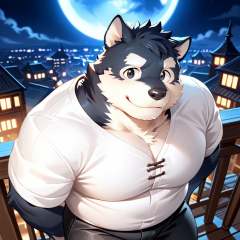 score_9, score_8_up,, lindong, furry, anthor, non human, chubby, gain weight beautifully, dog, young man, black shiba, black fur, black eyes, white iris, white thick eyebrows, smile, no beard, perfect face, perfect eyes, eye glittering, white medieval robe, shirts, black pants, hi res, absurd res, digital media(artwork), solo, <lora:SketchV1:1> <lora:bm-v3g-n2-ep1-xl:0.7> <lora:Expressive_H:1>, black shiba leaning on the rooftop railing, looking at the viewer. deep night sky, large glowing moon, a cityscape with tall buildings stretches into the distance, emphasizing the height. The wind gently moves the character's fur and clothes. Cinematic lighting, dramatic atmosphere, from above, top view,