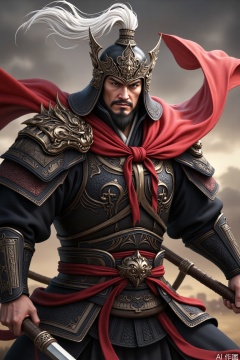 A general with a serious expression and sharp eyes has a powerful aura. He wears an exaggerated - shaped helmet with a white streamer on the top. The front of the helmet has sharp protrusions and complex metal decorations, resembling a beast's head. He is clad in black - based armor with red streamers and golden patterns. The shoulder guards are in the shape of dragon heads, and the surface of the armor is carved with mysterious patterns. He holds a long - handled weapon, and his red cape spreads out on the sides, giving people an imposing feeling without showing anger.,Ancient figures of the Three Kingdoms period
