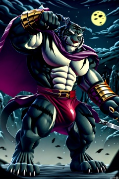 solo, looking at viewer, gloves, 1boy,night, holding, animal ears, full body,scar on body,black fur, weapon, male focus, thighs, sword, dark fur, fingerless gloves, armpits, cape, holding weapon, muscular, facial hair, thick thighs, holding sword, tiger ears, pectorals, muscular male, bara, pelvic curtain, furry, large pectorals, bulge, furry male,character:PangSP