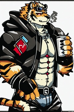 solo, short hair, 1boy, navel, holding,red eyes,animal ears, nipples, jacket, tail, white hair, male focus, open clothes, alternate costume, belt, pants, fingerless gloves, stomach, open jacket, cup, muscular, feet out of frame, abs, sunglasses, pectorals, muscular male, holding cup, bara, furry, large pectorals, furry male, tiger ears, disposable cup, bare pectorals, white and black fur, tiger boy,character:PangSP