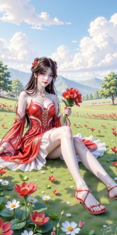 The beautiful spring scene is a vast green grass in the background, with bright red flowers blooming on the grass, like a sea of red flowers, and in the distance are continuous green mountains and blue sky and white clouds. The sun shines on the grass, the light and shadow are soft, the breeze is gentle, and the flowers are swaying in the wind. Sitting in the middle of the grass was an elegant beauty, wearing a red and white dress, revealing her slender long legs. Her long hair was lit up in the wind, holding a bouquet of red flowers in her hand, smiling and gentle eyes. The overall picture is full of vitality and romance, with bright colors and delicate light and shadows, just like a dream of spring.