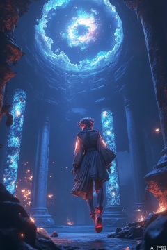 The broken white marble pillars and the suspended neon billboard in the background erode each other. The holographic light wheel behind the girl is swallowing the strokes of classical oil paintings. The binary nebula rotates deep in the iris reflects the birth and collapse of the entire digital civilization. The chain wrapped around the ankle is both a bond and a weapon. Each ring of the lock oscillates at high frequency between the entity and the data state, turning existence itself into a sharp blade that tears the space-time dimensions.,YT Chinese style old movie style