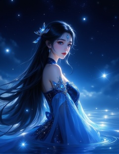 A digital illustration shoot from a profile camera angle about a beautiful asian woman with long black hair and blue eyes,wearing a blue and black dress,standing in the middle of the image. the woman appears to be a young *****,with a calm and serene expression,looking directly at the viewer with her blue eyes. her hair is styled in a long,flowing fashion,and she is adorned with a blue gem on her forehead. she is dressed in a blue dress with a high collar and intricate details,and her bare shoulders and medium-sized breasts are visible. the background is a dark,starry night sky with floating light effects,creating an ethereal atmosphere. the image is highly detailed and has a dreamy,ethereal quality.,1girl,long hair,solo,upper body,blue eyes,hair ornament,water,dress,black hair,closed mouth,earrings,from side,jewelry,looking at viewer,<lora:动漫美女1 (1):1>,