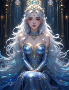 A digital illustration shoot from a below camera angle about a fantasy character with long white hair and a crown, dressed in intricate blue and gold attire, seated in a dark, mystical environment. the image also shows dramatic lighting and intricate details. on the middle of the image, a 1girl, who appears to be a young *****, who is facing the viewer and looking at the viewer, with a gentle smile and a closed mouth expression, wearing a revealing blue and silver dress with gold accents. the dress has a high collar and a low-cut design, revealing her medium-sized breasts and cleavage. she has long, flowing white hair, yellow eyes, and is wearing a tiara. her body is slim and she has bare shoulders. the background is dark and mystical, with stained glass windows and metallic structures.1girl, solo, long hair, white hair, yellow eyes, dress, breasts, looking at viewer, sitting, blue dress,<lora:动漫美女1 (1):1>,