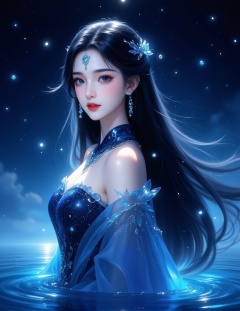 A digital illustration shoot from a profile camera angle about a beautiful asian woman with long black hair and blue eyes,wearing a blue and black dress,standing in the middle of the image. the woman appears to be a young *****,with a calm and serene expression,looking directly at the viewer with her blue eyes. her hair is styled in a long,flowing fashion,and she is adorned with a blue gem on her forehead. she is dressed in a blue dress with a high collar and intricate details,and her bare shoulders and medium-sized breasts are visible. the background is a dark,starry night sky with floating light effects,creating an ethereal atmosphere. the image is highly detailed and has a dreamy,ethereal quality.,1girl,long hair,solo,upper body,blue eyes,hair ornament,water,dress,black hair,closed mouth,earrings,from side,jewelry,looking at viewer,<lora:动漫美女1 (1):1>,
