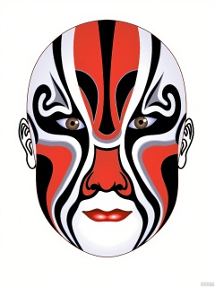 LP, A digital illustration of a traditional Chinese opera mask, characterized by intricate black and red patterns. The mask features symmetrical swirls and abstract designs, with a central vertical stripe in black and red. The mask has a white border and a central red oval shape with black and red accents. The eyes are small and circular, and the mouth is a simple red line. The background is plain white, emphasizing the mask's detailed design. The style is bold and vibrant, with a strong emphasis on traditional Chinese artistry.