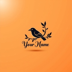 black and white logo,bird perched on a branch with leaves,"your name" in cursive font below,minimalist style,clean lines,geometric shapes,black,white,orange colors,gradient orange and brown background,natural light from top left,soft shadows,<lora:印纹(2):1>,