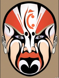 LP, A digital illustration of a traditional Chinese opera mask, featuring bold red and black colors. The mask has a central white yin-yang symbol on the forehead, with white and black swirling patterns around the eyes. The mouth is painted in a pale beige color. The background is plain white, emphasizing the mask's intricate design. The illustration style is clean and modern, with smooth shading and sharp lines.