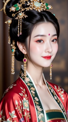 The upper robe adopts a wide-sleeved design, with contrasting cuffs and necklines, and bordered with dark green brocade. On the brocade, gold thread is embroidered with wishful cloud patterns, and the cloud patterns are winding and lively, as if they contain auspicious blessings. The collar is in the style of a cross-collar, slightly open, just revealing a small piece of white neck just right, adding a bit of sexy charm against the backdrop of the red color. The fabric of the upper robe is made of thick brocade, and colorful silk threads embroidered complex peony patterns. The needlework is delicate and subtle, and the peony postures are numerous. Whether the petals are stretched and the elegance is displayed, or when the petals are in bud are shy, which fully displays the gorgeous wealth of the Tang Dynasty.