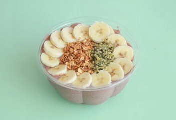 sks smoothie bowl made with almond milk, peanut butter, topped with banana slices, granola, and hemp seeds - V1