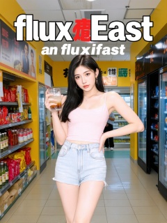 This is a clear,modern image with a stylish aesthetic. In the picture,there is a young woman wearing a pink **** top and denim shorts,holding a drink in one hand and resting her other hand on her hip,displaying a confident stance. Her eyes are looking at the camera,and her expression is natural. She has a slim figure and fair skin. Her hair is black and falls over her shoulders. The pink **** top she is wearing is simple and generous,while the denim shorts are fashionable and casual. The background features a supermarket with shelves stocked with various goods,including snacks and drinks. The supermarket walls are yellow,adorned with advertisements and signage. Overall,the image gives a sense of everyday life and reality.,There is a prominent artistic font above the picture,which reads' fluxEast 'in English,