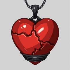 A digital drawing of a large,red,crystalline heart-shaped pendant with a cracked,molten lava-**** texture,encased in a black,twisted metal band. The pendant hangs from a thin,metallic chain against a plain gray background. The style is semi-realistic with a focus on vibrant colors and detailed textures.,