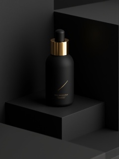 miluo_bzsj, A sleek, black perfume bottle with a gold label sits on a minimalist, geometric surface, surrounded by shadowy, rectangular blocks. The bottle's matte finish and subtle gold text pop against the dark, textured background, creating a posh, modern vibe.<lora:miluo丨包装设计丨现代简约-1.3:1>