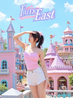This is a highly clear and cartoon-style image. In the picture,there is a young female wearing a pink **** top and white denim shorts,with her hair tied up in a ponytail and adorned with a pink bow hair accessory. She is looking into the distance,with one hand placed on her forehead as if shielding the sunlight. The background features a whimsical amusement park filled with various colorful cartoon buildings and decorations,such as castles,trees,and street lamps.,There is a prominent artistic font above the picture,which reads' fluxEast 'in English,