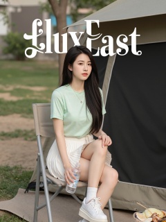 This is a clear,everyday style photo with a high degree of clarity. In the photo,we see a young woman sitting on a chair next to an outdoor tent. She is wearing a light green short-sleeved T-shirt and a white pleated skirt,with white sports shoes on her feet. Her hair is black,flowing over her shoulders,and it looks smooth and shiny. In her hand,she holds a bottle of mineral water,perhaps taking a break or enjoying outdoor time. Under her feet,we can see some grilled food,which may be prepared for a picnic. The entire scene gives a relaxed and pleasant feeling.,There is a prominent artistic font above the picture,which reads' fluxEast 'in English,