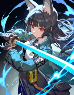 1girl,hoshimi miyabi,zenless zone zero,rei \(sanbonzakura\),torino aqua,(ciloranko:0.9),lack,from above,from side,foreshortening,animal ear fluff,black gloves,black hair,black necktie,black skirt,blunt bangs,closed mouth,fox ears,fox girl,green jacket,high-waist skirt,holding sword,glowing katana,energy,long hair,red eyes,serious,sidelocks,solo,white shirt,blue theme,black background,depth of field,cinematic,masterpiece,best quality,good quality,newest,highres,absurdres,