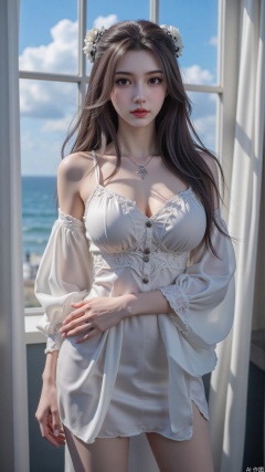 Very detailed face, extremely detailed eyes and face, (vacuum), 8K wallpaper, light leak, beautiful and detailed girl, extremely detailed CGUnity8K wallpaper, an extremely detailed and beautiful, beautiful and detailed eyes, masterpiece, best quality, Real photo level, (frontal shooting panoramic perspective), ( (Full body photo)), dynamic angle, dynamic pose, solo, ancient style silver hairpin with petals, blue sky and white clouds, (C cup), (huge round breasts), slender legs, super good figure, stunning beauty, (whole body in the mirror) , (wearing Lolita nightgown), (light reflects the shadow of the body through the clothes),vacuum,bare and smooth