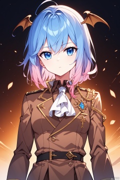 1girl,solo,blue eyes, gradient hair, blue hair, pink hair, head wings, ascot, high collar, military uniform, brown jacket, brown skirt, masterpiece,best quality,official art,extremely detailed CG unity 8k wallpaper,upper body,looking at viewer,Face me,