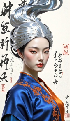 The image depicts a highly stylized portrait of a woman with a striking and artistic appearance. She is dressed in traditional attire, featuring a blue garment with intricate orange embroidery. Her hair is elaborately styled, with a metallic silver swirl that gives a sense of movement and elegance. The background includes artistic calligraphy in black ink, adding a cultural and historical touch to the composition. Additionally, there are red stamps and seals on the right side of the image, which are traditional in nature, likely indicating the artist's signature or a mark of authenticity.