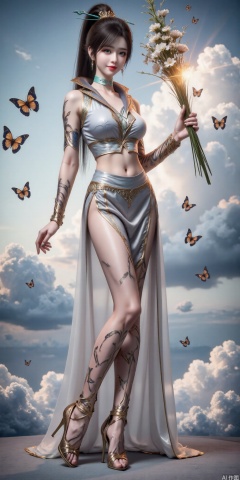 and she holds a bunch of flowers  , which extends upwards and is illuminated by a radiant light. Surrounding her are numerous butterflies, their delicate wings shimmering in the soft light. The background consists of a sky filled with fluffy, white clouds, creating a dreamy and mystical atmosphere. The overall composition exudes a sense of tranquility and otherworldly beauty.,qinglin,High ponytail, hair ornament,green eyes