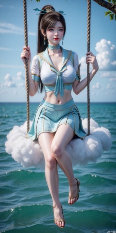 真人肌肤纹理, 4K画质,完美身材,long legs,Film texture, film and television, surrealism, a girl with a delicate face is sitting on a cloud swing. The girl is wearing a jk sailor uniform, a white short-sleeved shirt, light blue stripes trimming, a light blue tie, white blue pleated skirt, exquisite diamond-encrusted high heels, swing rope The sub is connected to a cloud in the sky, the background is a vast ocean, the water shows a consistent blue-green tone, the sky is also blue-green, blending with the ocean, perfect light and shadow, hyper-realistic photography, sharpening, artistic conception, Consciousness, large areas of blank space, sense of space, haziness, dreams, fog,qinglin,High ponytail, hair ornament,green eyes