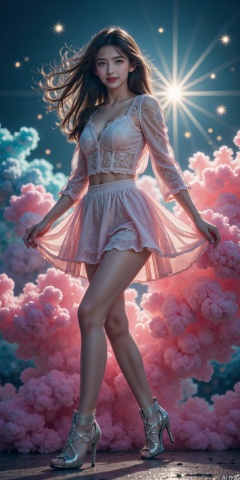 surreal warm cinematic full body shot photography, Kodak Professional Portra 160, 良好解剖结构,真人肌肤纹理, 4K画质,完美身材,1girl,looking_at_viewer,navel,,exquisite diamond-encrusted high heels, ,,argyle legwear,star \(symbol\), ,super long legs, ,realistic,,pose for picture,Dynamic posture,