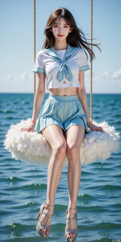 surreal warm cinematic full body shot photography, Kodak Professional Portra 160, 1girl,looking_at_viewer,navel,,exquisite diamond-encrusted high heels, ,kind smile,. , argyle legwear,star \(symbol\),super long legs, ,realistic,,pose for picture,Dynamic posture, ,良好解剖结构,真人肌肤纹理, 4K画质,完美身材,long legs,Film texture, film and television, surrealism, a girl with a delicate face is sitting on a cloud swing. The girl is wearing a jk sailor uniform, a white short-sleeved shirt, light blue stripes trimming, a light blue tie, white blue pleated skirt, exquisite diamond-encrusted high heels, swing rope The sub is connected to a cloud in the sky, the background is a vast ocean, the water shows a consistent blue-green tone, the sky is also blue-green, blending with the ocean, perfect light and shadow, hyper-realistic photography, sharpening, artistic conception, Consciousness, large areas of blank space, sense of space, haziness, dreams, fog,feifei
