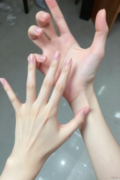 Hands with fair skin, smooth joint lines, delicate skin on the hands, presenting a soft and fair color, slender fingers, realistic nails, close-up, details